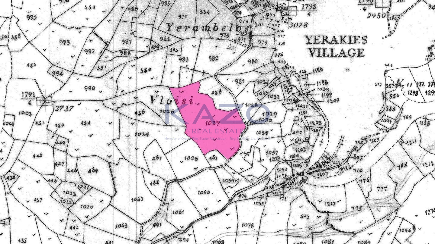 Expansive 12,394 sq.m. agricultural field located in Gerakies Community, Nicosia District. Property Highlights: • Total Field Area: 12,394 sq.m. • Access: via a registered asphalt road along their eastern boundary offering a total frontage of approximately 85m. Location: The property is situated approximately: • 290m southwest of the Gerakies community center. • 160m west of the Gerakies–Kalopanagiotis road connection. • 35m west of the nearest residential zone. The property falls within Agricultural Zone Γ3, with a building density of 10%, coverage of 10%, and permission for up to 2 floors with a maximum height of 8.3 m. There is a separate title deed for this property.