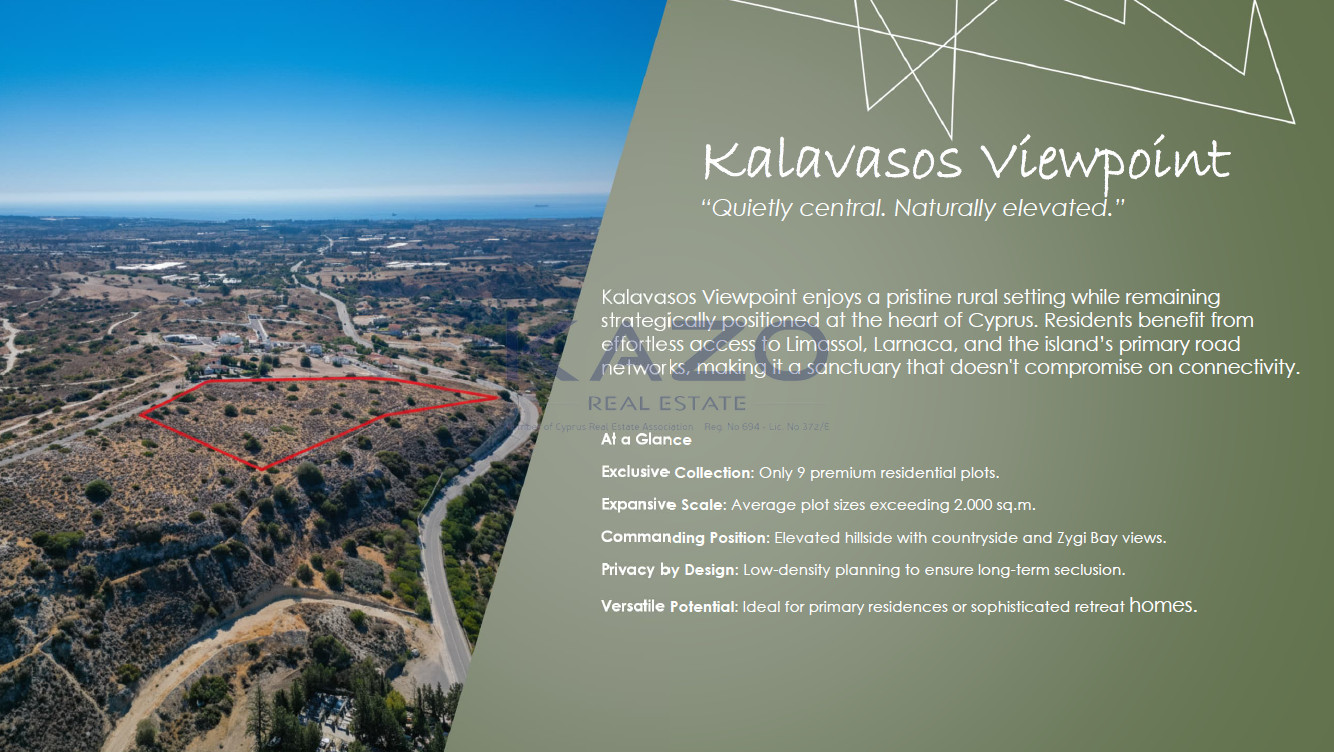 Kalavasos is known for its traditional architecture, tranquil atmosphere, and scenic surroundings. Nestled among rolling hills and lush landscapes, the area offers a unique blend of rural charm and modern convenience. The village center provides a variety of amenities, including shops, cafes, and local services, just a short drive from the plot.