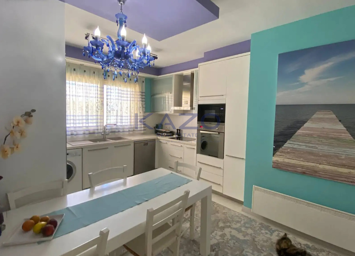 Built in 2016, the apartment boasts a contemporary design and is easily accessible by elevator. Large windows offer an abundance of natural light, while the open-plan layout creates a welcoming atmosphere. From the living area, step out onto your private balcony to enjoy sweeping sea views, perfect for relaxing after a busy day.