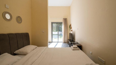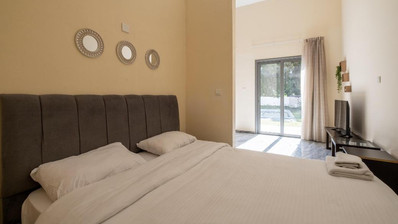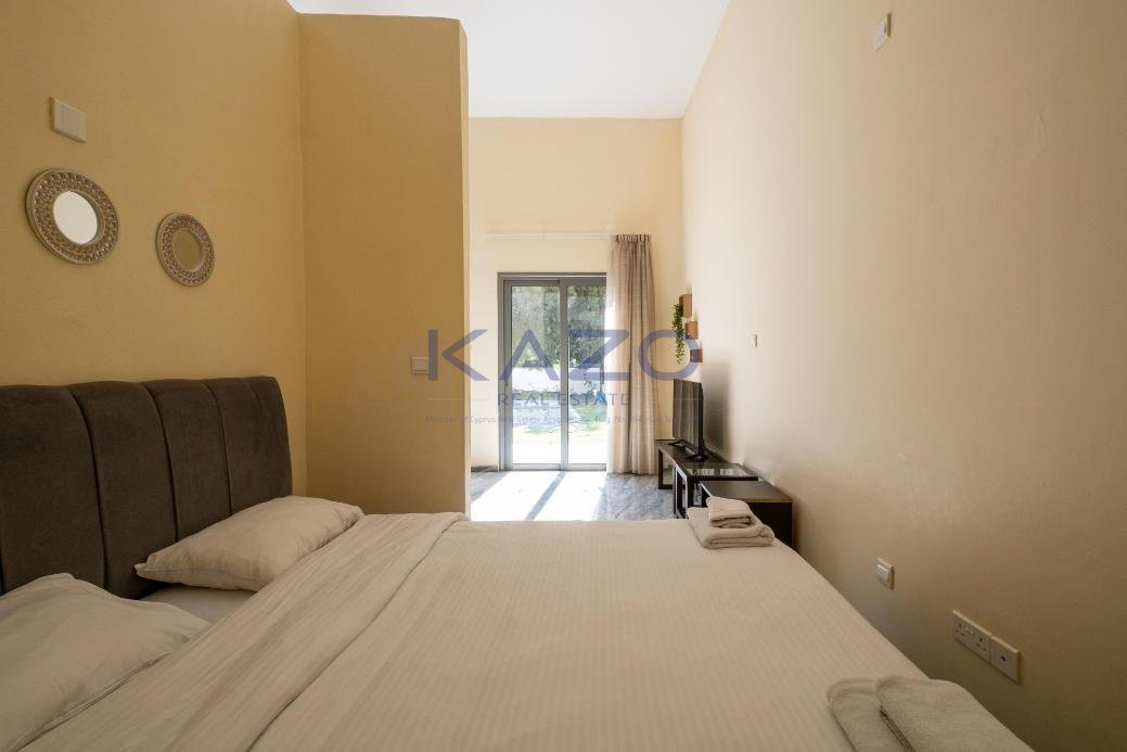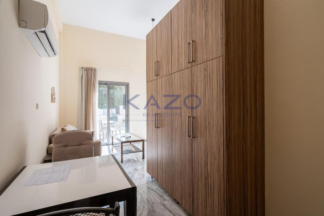 The studio has a covered area of 48sqm and uncovered verandas of 22sqm. It is situated on the ground floor of Block C. It consists of an open plan area with kitchenette, sitting area, a double bed, a bathroom with toilet and a private swimming pool.