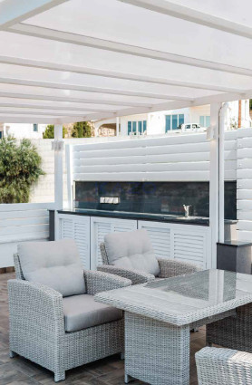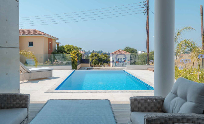 Built in 2018 and fully furnished, the property is ready to move in. The open-plan layout opens up to a private, south-facing swimming pool, perfect for relaxation or entertaining guests. Large windows invite plenty of natural light, while quality furniture adds to the inviting atmosphere.