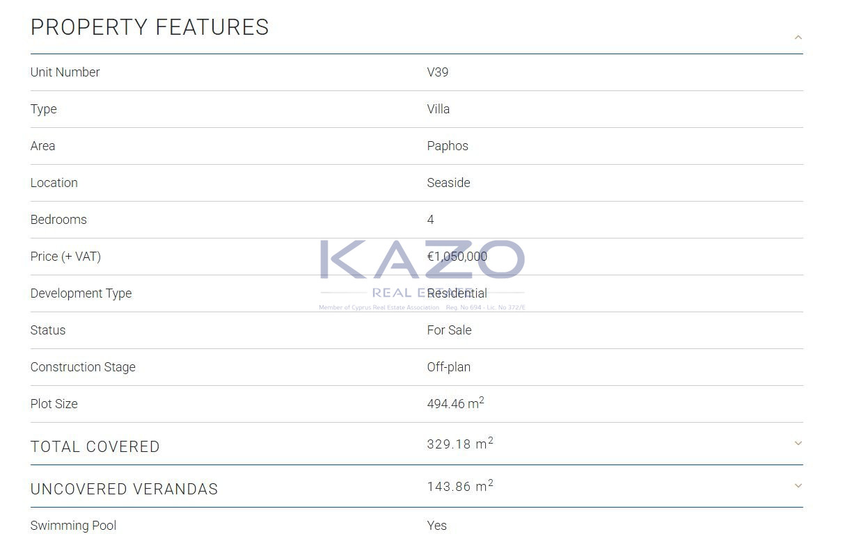 All properties displayed at www.kazo.com.cy are subject to availability. Kazo Real Estates makes no warranties, undertakings or representations with respect to the content of the website (such as accuracy, quality, comprehensiveness etc of such content) and no liability or responsibility of any kind whatsoever is accepted by Kazo Real Estates concerning the information contained in this website.